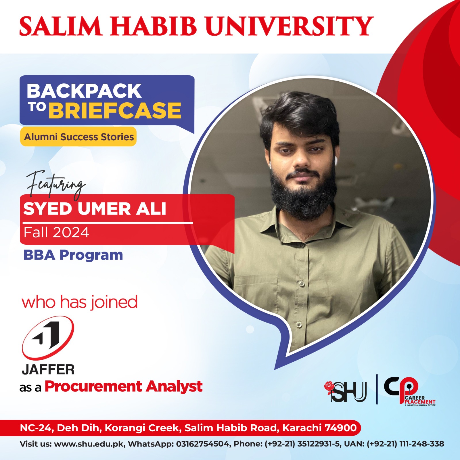 In today’s edition of the Salim Habib University Career Placement & Industrial Liaison Office’s Backpack to Briefcase Series of Alumni Success Stories, we feature Syed Umer Ali, a BBA graduate of the Class of 2024, who has landed a role at Jaffer Group of Companies as a Procurement Analyst.